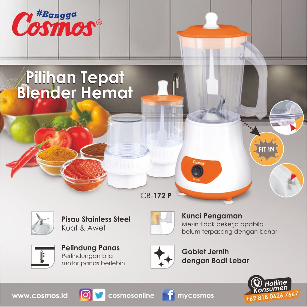 Cosmos blenz ini adalah blender multifungsi 5 in 1 yang dilengkapi dengan goblet plastik dengan kapasitas 1,2 liter, yang berfungsi untuk mengolah bahan makanan dengan 3 pilihan fungsi yakni dry mill (penggiling bumbu kering), wet mill (penggiling bumbu basah), chopper (penggiling daging), dan filter (penyaring ampas). Cosmos blender plastik 3in1 cb 282p/ pelumat cb 282 p /cosmos cb282p: Untuk harga blender cosmos 3 in 1 lebih murah dibandingkan dengan harga blender cosmos 4 in 1. Anda bisa mencari produk ini di toko online yang mungkin jual new blender cosmos plastik. Sehingga anda dapat mengolah makanan hanya dengan satu alat saja. Blender cosmos cb 282p / cb282p 3in1 plastik 2l bukan miyako philips: Cosmos blenz ini adalah blender multifungsi 5 in 1 yang dilengkapi dengan goblet plastik dengan kapasitas 1,2 liter, yang berfungsi untuk mengolah bahan makanan dengan 3 pilihan fungsi yakni dry mill (penggiling bumbu kering), wet mill (penggiling bumbu basah), chopper (penggiling daging), dan filter (penyaring ampas). Kenapa dinamakan 3 in 1 karena blender ini mempunyai tig fungsi sekaligus yaitu untuk blender, chooper serta beater. Kenapa dinamakan 3 in 1 karena blender ini mempunyai tig fungsi sekaligus yaitu untuk blender, chooper serta beater.